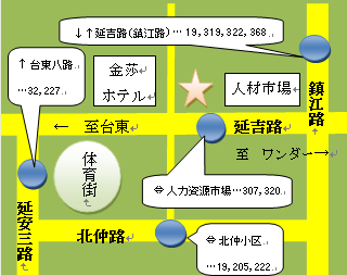 (香港花園)辛家庄―222→北仲小区 下車後、体育街を北へ抜けて、延吉路を右折。3分直進。 五十七中―320→人力資源市場 下車後、目の前。 (青島大学)青大(高雄路)―320→人力資源市場 青大(高雄路)―227→台東八路 下車後、四平路を降りて、延吉路を5分直進。 (延吉路ワンダー)図書館(延吉路)―307,320→人力資源市場 |