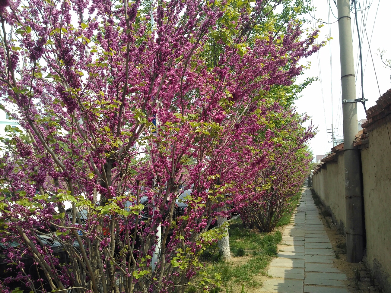 ちょうど取材日は街路樹の花が満開。歩道がお花でいっぱいに。