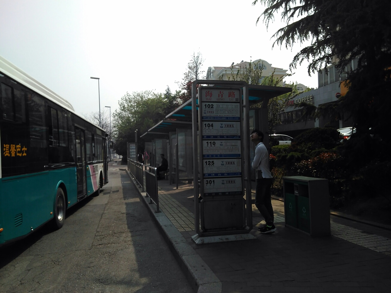散策後は海青路を登っていって、香港東路へ。渡って左の「海青路」バス停から市内へ。