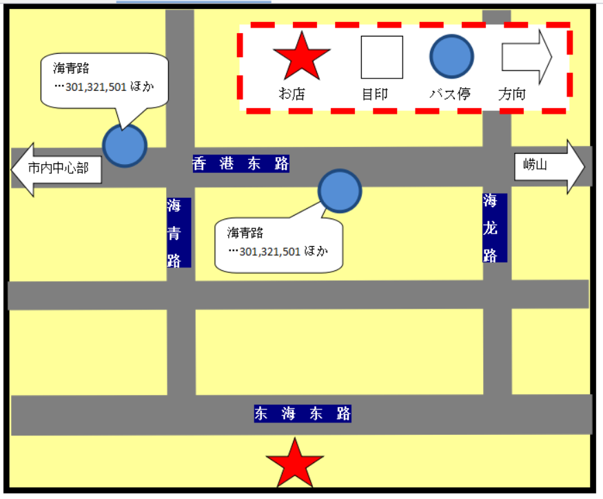 市内からバスで「海青路」バス停まで。そこから前方の海龍路を海沿いへ降りていこう。