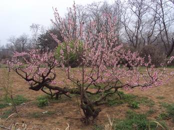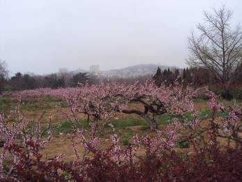 4月から5月の間は、ここ一面桃の花が咲き誇ります。天気がよければ、向こうに小魚山公園もみえます。