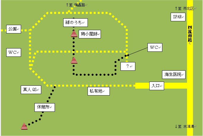 山頂散策を終えて、鶏小屋散策も終え、ちょっと休憩。おすすめは、そこからもう少し進んだところに緑の小屋あり。緑も多く、通気性も抜群!ひんやりしていて、のんびりできます。帰りは、その奥の階段から一直線!